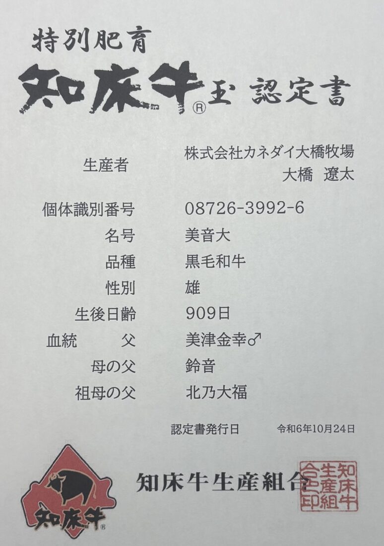 大橋さんは繁殖から一貫して育てる雌牛の「特別肥育・知床牛」格付け(日本格付協会)を意識せず、脂の質、筋肉の味に特化した育て方(約30ヶ月以上肥育)や、北海道出身で芸能界きっての『肉マニア』でもあるEXILE SHOKICHIさんと北海道初導入となる純血但馬牛を一緒に育てる「八将牛(はちまさぎゅう)」プロジェクトなど、積極的に新しい取り組みを行なっています。